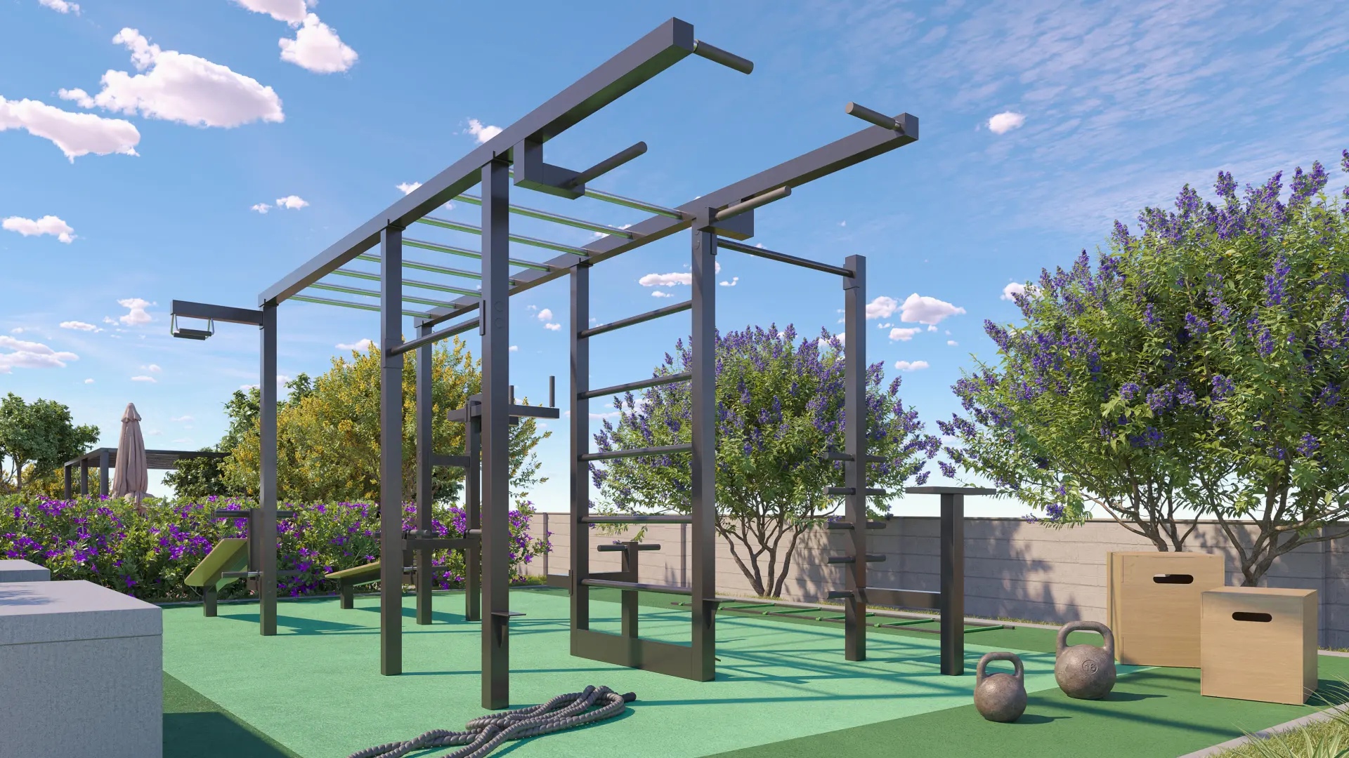 Academia ao ar livre com equipamentos profissionais e vista para o jardim botânico. Área para alongamento em deck de madeira e estações funcionais. No Vale das Tulipas, exercitar-se torna-se inspiração diária com o canto dos pássaros como trilha sonora. Um convite para fortalecer corpo e mente em conexão com a natureza, onde cada treino é uma oportunidade de renovação pessoal em ambiente livre de poluição e estresse urbano.